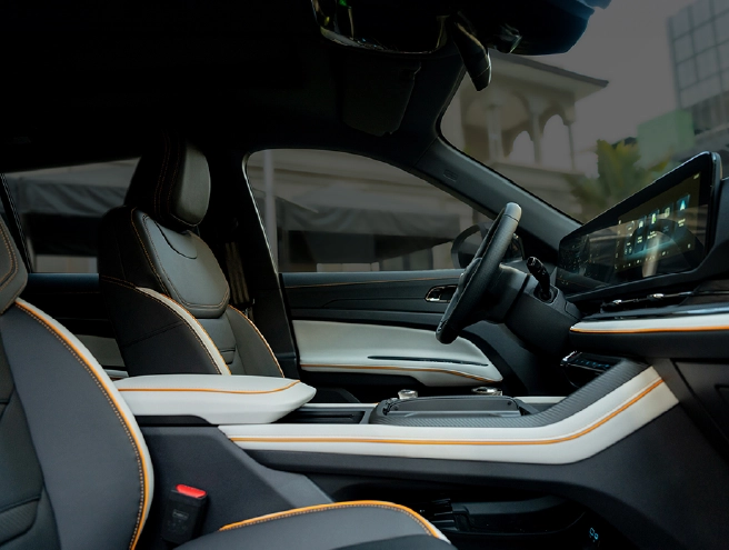 Ghế bọc da sang trọng với điểm nhấn là những chi tiết màu trắng và cam trẻ trung, cá tính, tạo nên phong cách ấn tượng cho chủ sở hữu của chiếc xe.